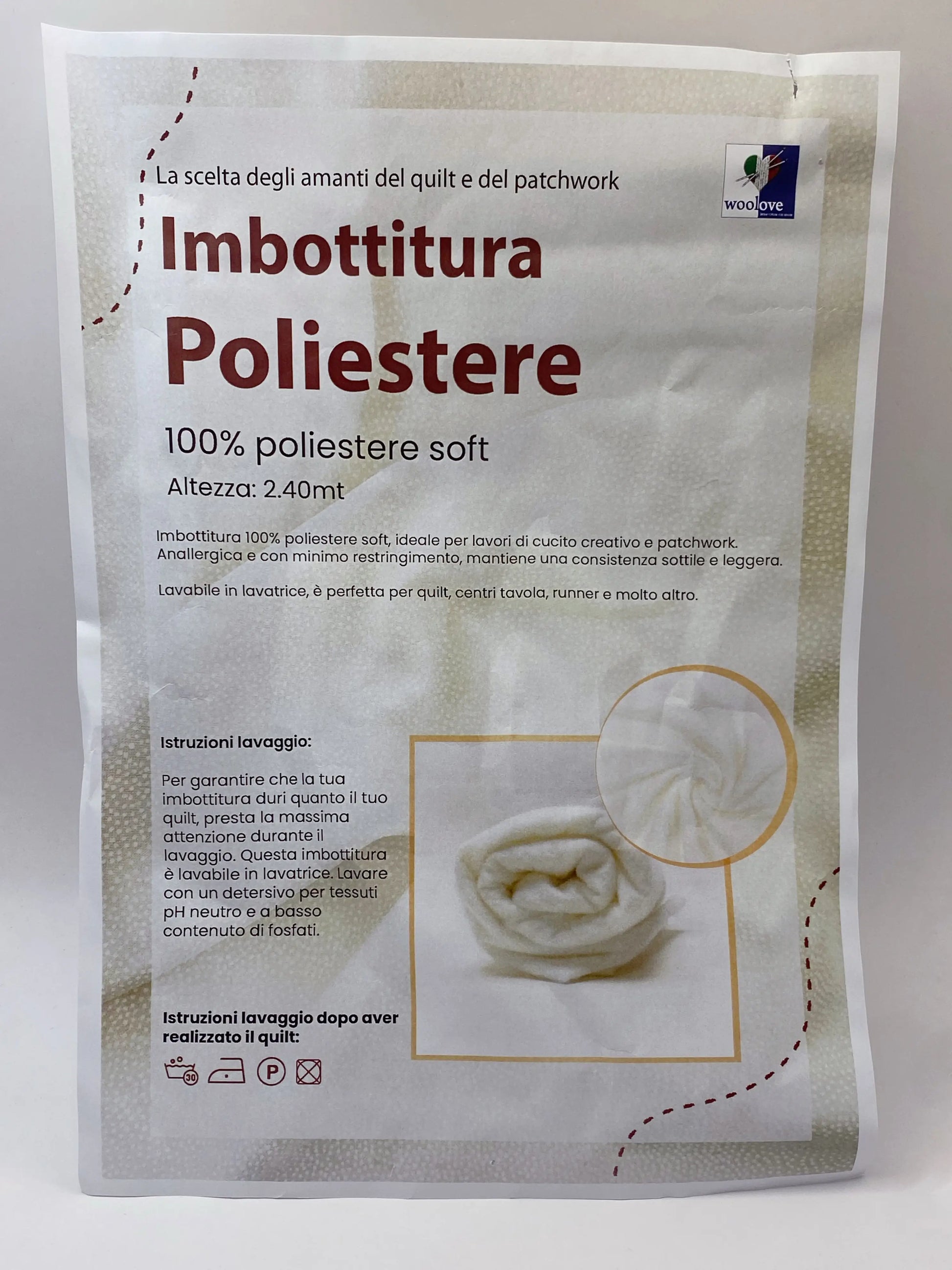La scelta ideale per gli amanti del quilt e del patchwork. Imbottitura 100% poliestere soft, ideale per lavori di cucito e patchwork. Anallergico e con minimo restringimento, mantiene una consistenza sottile e leggera. Lavabile in lavatrice, è perfetta per quilt, centrotavola, runner e molto altro. Si consiglia di utilizzare un semplice sapone neutro per il lavaggio. 100% poliestere - H 2.40 mt