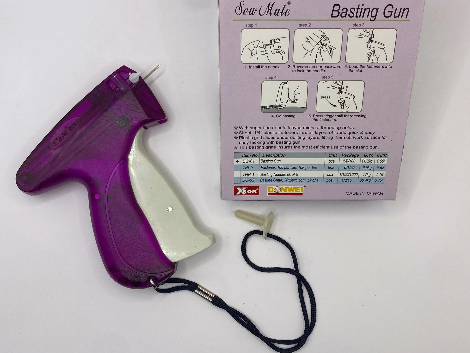 La pistola è dotata di un ago super sottile che lascia fori di infilatura minimi, preservando l'integrità del tessuto. Spara elementi di fissaggio in plastica da 1/4" che penetrano facilmente attraverso tutti gli strati di tessuto, assicurando un fissaggio solido e duraturo. La griglia in plastica scorre sotto gli strati trapuntati, sollevandoli dalla superficie di lavoro per una facile imbastitura. Questa innovativa griglia assicura l'uso più efficiente della pistola per imbastitura, migliorando la precisione e la velocità del lavoro.