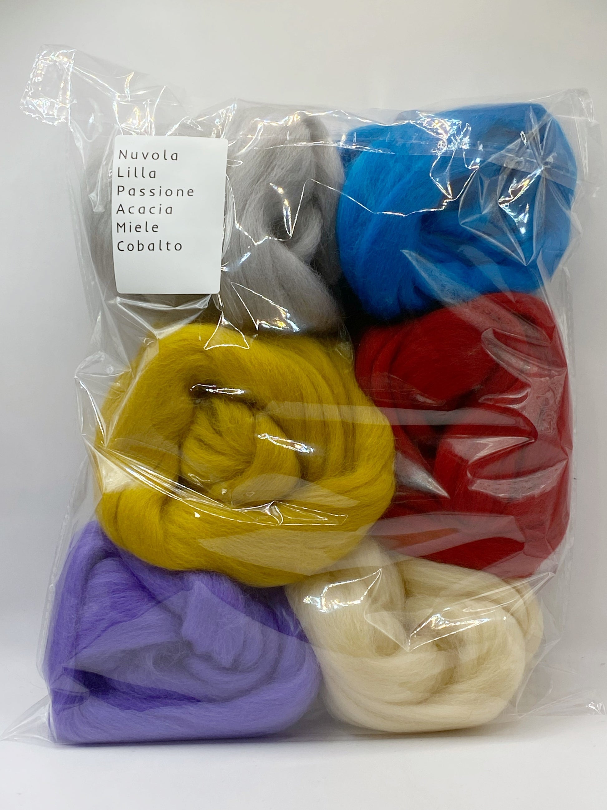 Colori vivaci e puliti, perfetti per soggetti moderni, decorazioni allegre e contrasti grafici (rosso/blu/giallo). Contiene: Nuvola, Lilla, Passione, Acacia, Miele, Cobalto. Ogni colore: 1 metro di lana cardata (totale 6 metri - circa138 grammi).