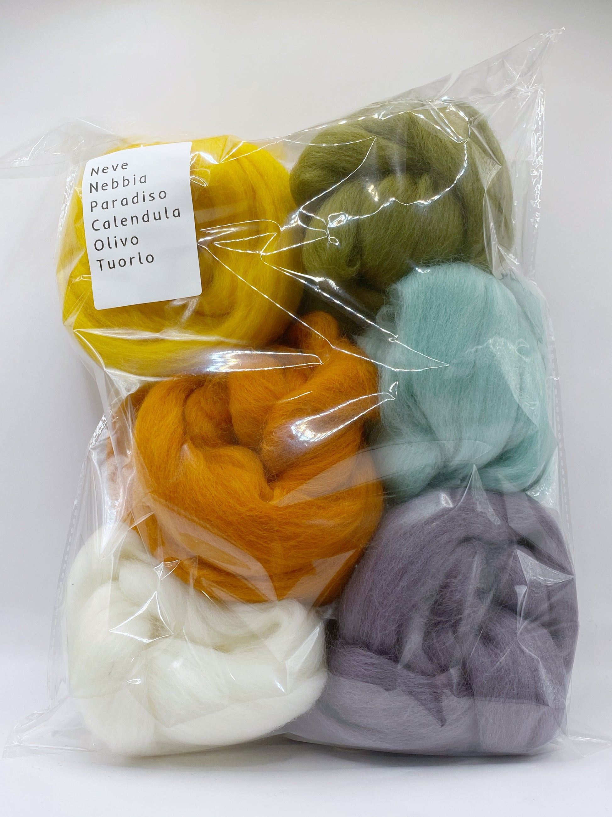 Palette calda e luminosa perfetta per needle felting, bamboline, decorazioni e dettagli botanici. Contiene 6 colori preselezionati: Neve, Nebbia, Paradiso, Calendula, Olivo, Tuorlo. Ogni colore è in quantità da 1 metro (totale 6 metri - circa 138 grammi), ideale per lavorare in armonia senza scegliere le tinte una a una.